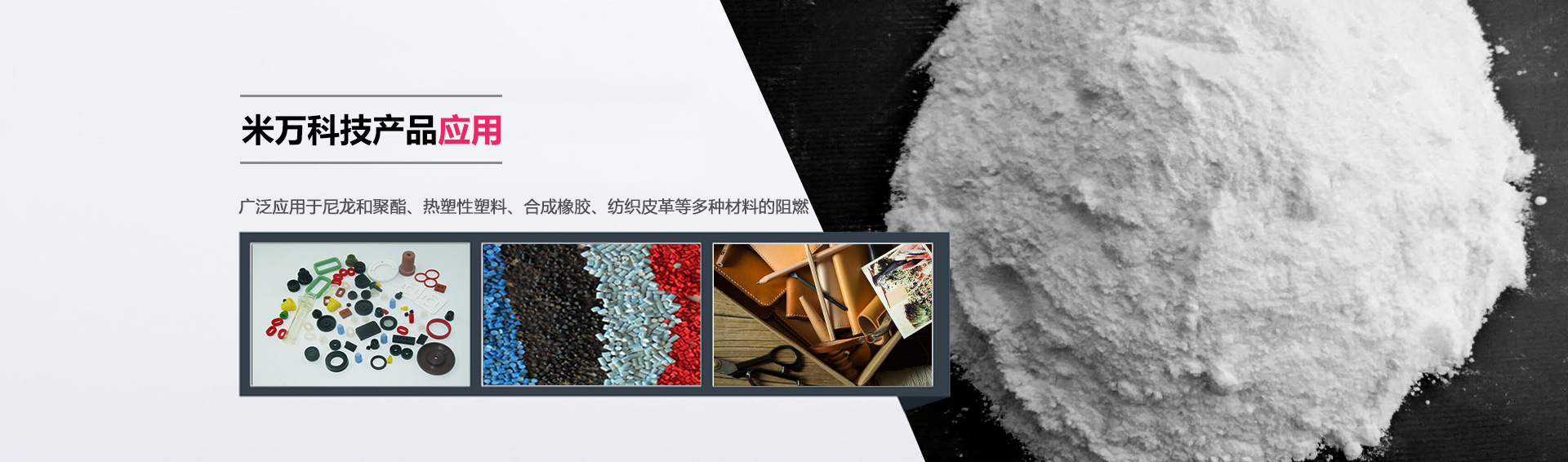 米萬科技在橡膠行業(yè)有一系列研發(fā)的阻燃劑產(chǎn)品。產(chǎn)品不含鹵素,由于表面經(jīng)過改